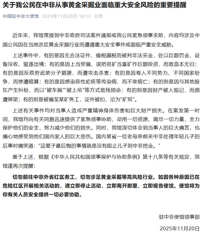 中国驻中非使馆领事部11月20日发布关于我公民在中非从事黄金采掘业面临重大安全风险的重要提醒。