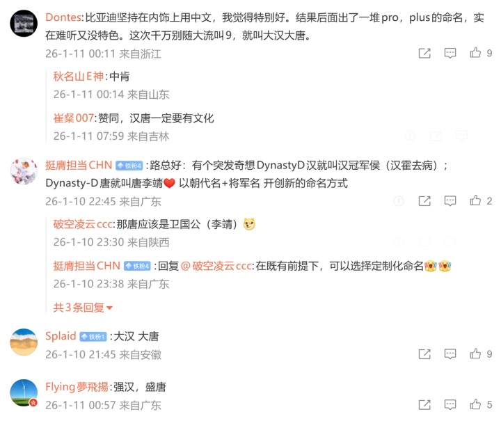 但是也有很多网友表示已经看腻了这种数字化命名,甚至对Pro、Max等后缀都颇感厌烦。反倒是“大唐”、“大汉”这样的命名简洁且有自信。这类命名能够唤起消费者对强汉盛唐的历史记忆,个人感觉也与比亚迪王朝系列的整体调性更加契合。