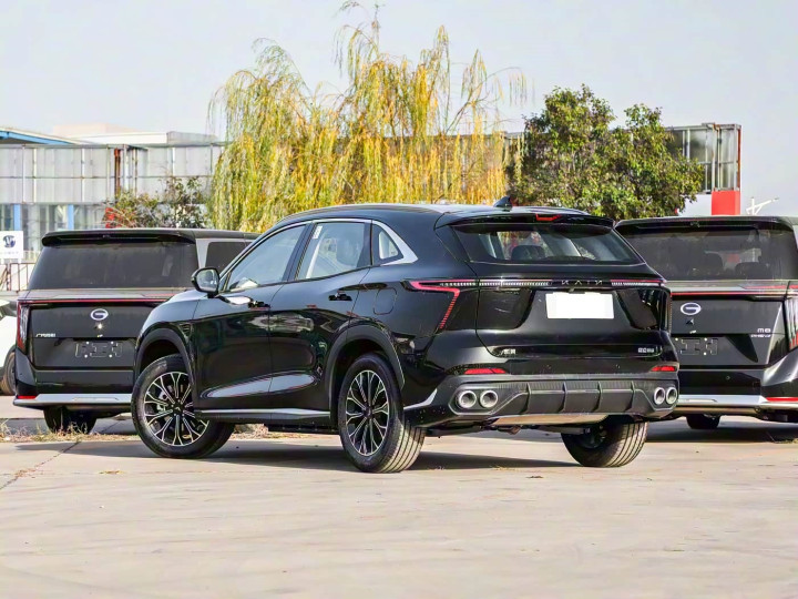 再来看车尾部分,车尾设计与前脸形成呼应,整体简洁饱满且运动气息浓郁。车顶配备镂空式扰流板,不仅优化了空气动力学性能,更营造出尾翼视觉效果,配合倾斜的后挡风玻璃,强化了轿跑SUV的既视感。贯穿式熏黑LED尾灯是车尾点睛之笔,点亮后灯光均匀通透,与前脸贯穿灯带形成首尾呼应,提升了夜间辨识度。牌照框区域采用内凹式梯形设计,点缀出车尾层次感,下方保险杠包裹大面积黑色饰板,营造出扩散器造型,搭配双边共四出排气布局,进一步释放运动潜能。